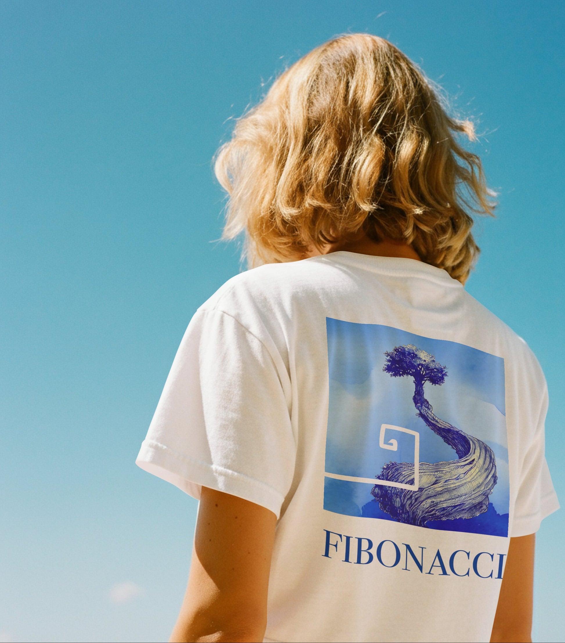 A lone tree stands at the edge of a mountain, its Fibonacci-formed trunk twisting upward, its roots breaking through stone in pursuit of life. Around it stretches an endless ocean of blue, from open sky to deep storm, from calm to chaos. Every shade tells a story. Every tone reflects a state of being.